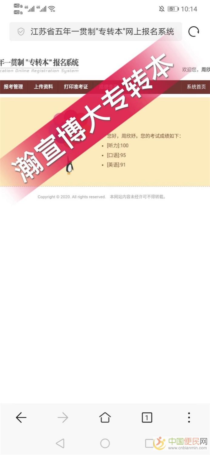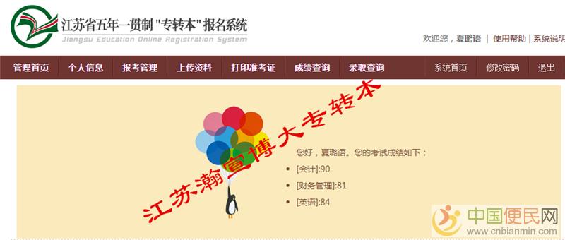 我们瀚宣博大很多学员已陆续查询到成绩,而今年很多考生英语和两门专业课成绩一般都在80以上、90分以上,而这也证明了今年的考试简单中_国_便_民_网。我们瀚宣博大专转本有个别考生三门总成绩竟达到了280分以上(报考南京三江学院的英语专业,总分286分,英语91,分,口语95分,听力100分),这应该是985、211的成绩了吧,不出意外的话应该是今年的状元!